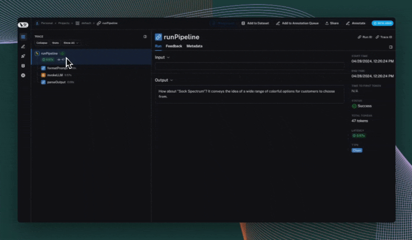 Note that when wrapping a sync function with traceable, (e.g. formatPrompt in the example below), you should use the await keyword when calling it to