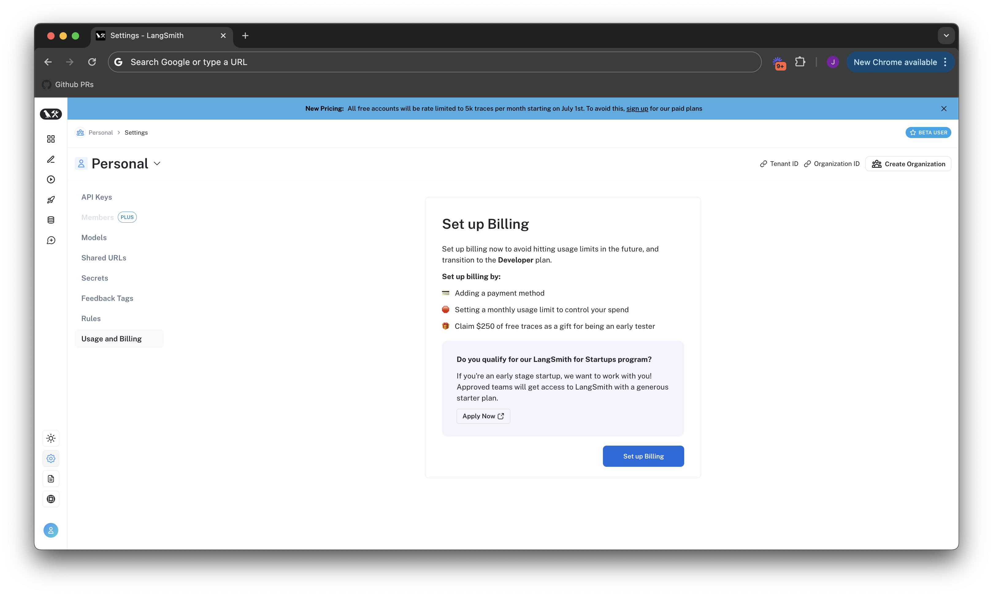 If you joined LangSmith before pricing was introduced on April 2, 2024, you have the option to upgrade your existing account to set up billing. If you did not set up billing by July 8, 2024, then your account is now rate limited to a maximum of 5,000 traces per month.- Navigate to the Settings page.