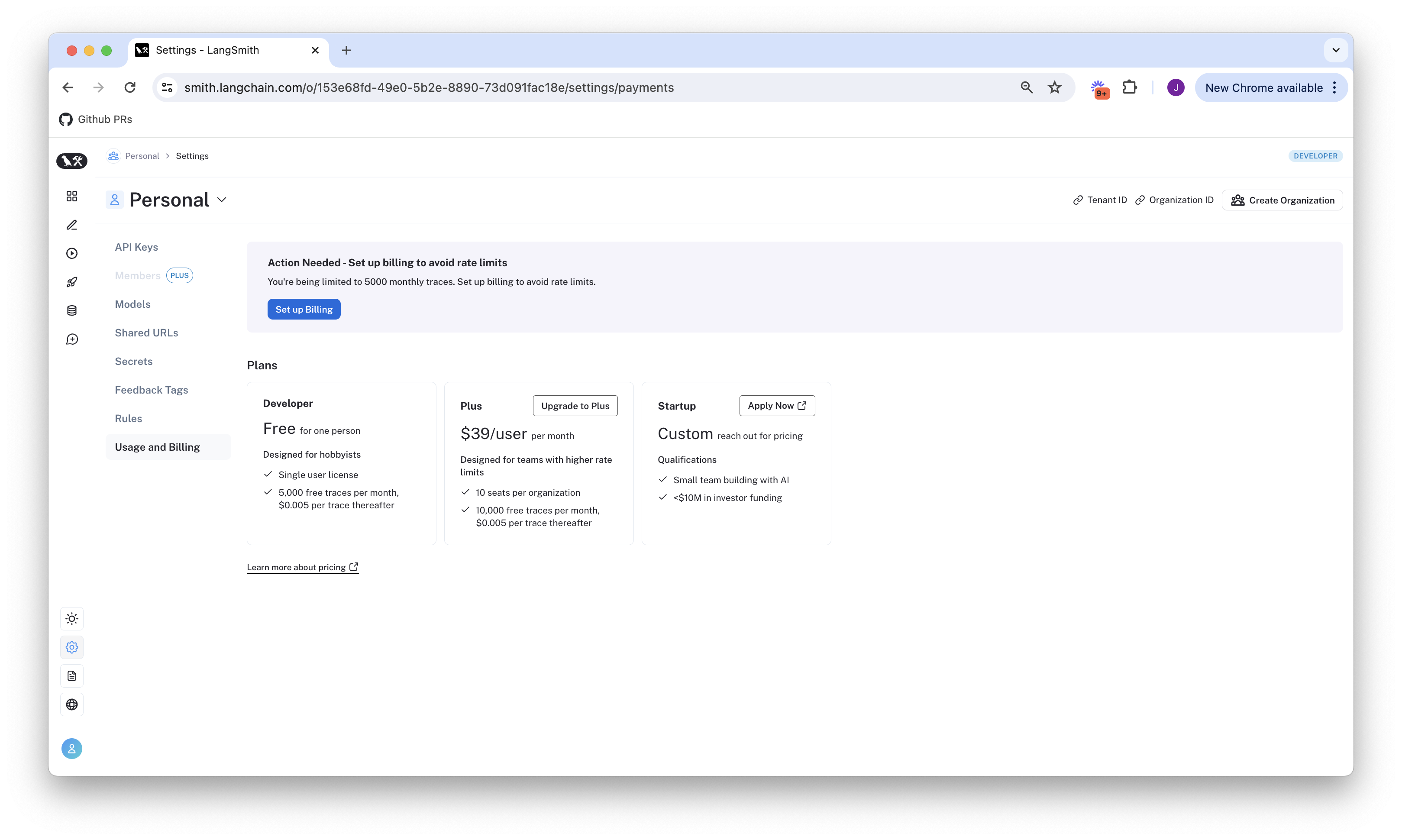 Developer Plan: set up billing on your personal organization