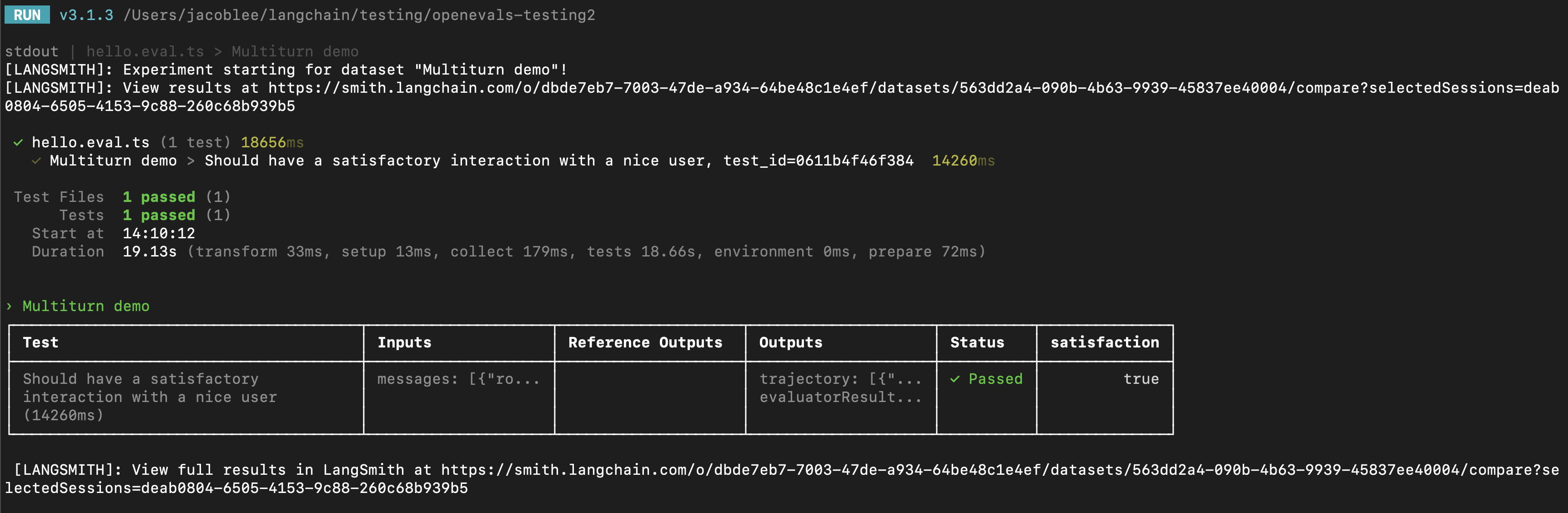 You can use the results of multi-turn simulations as part of a LangSmith experiment to track performance and progress over time. For these sections, it helps to be familiar with at least one of LangSmith’spytest (Python-only), Vitest/Jest (JS only), or evaluate runners.