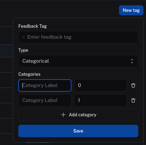 For categorical feedback, you can enter a feedback tag name, then add a list of categories, each category mapping to a score. When you provide feedback, you can select one of these categories as the feedback score. Both the category label and the score will be logged as feedback invalue and score fields, respectively.